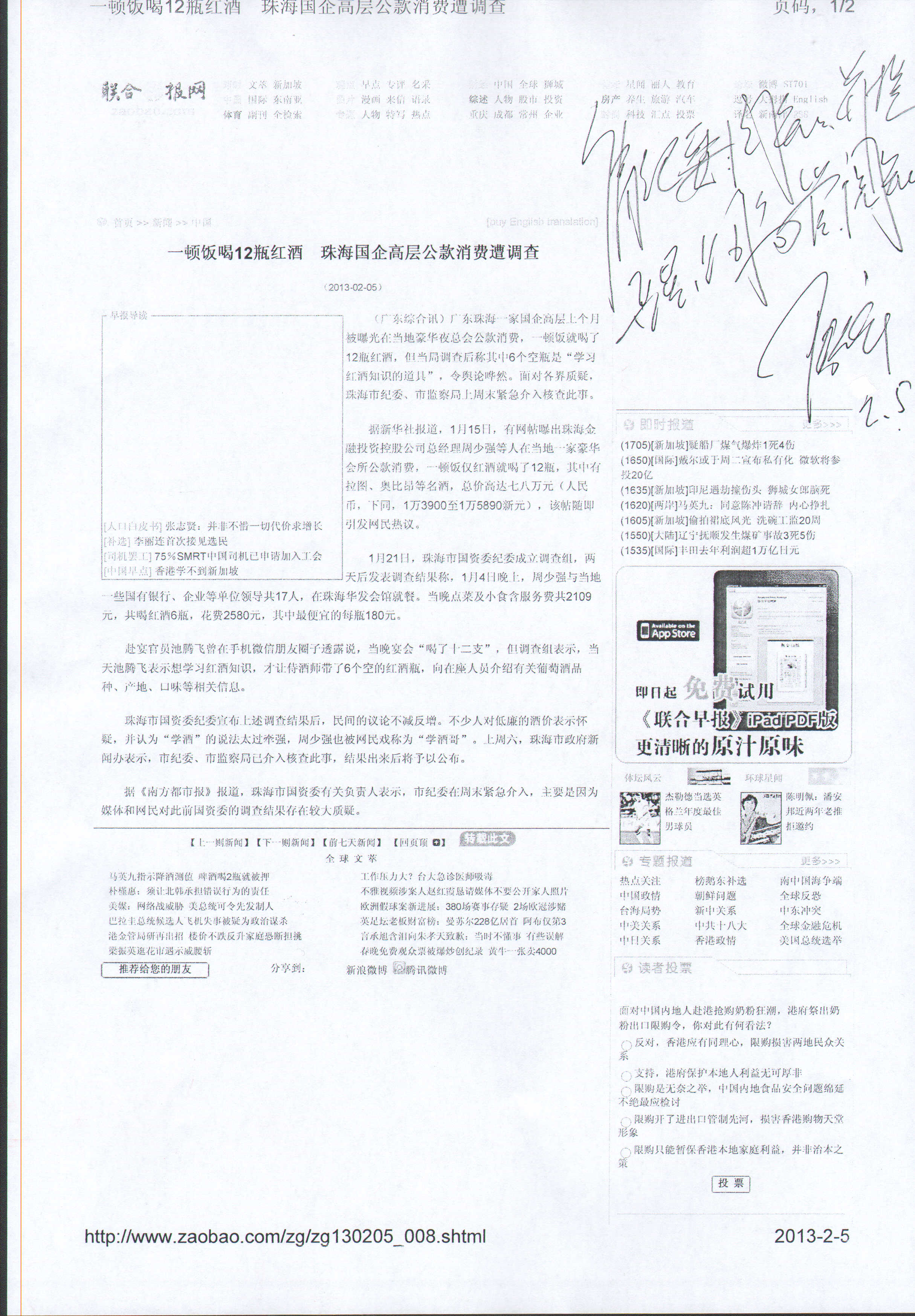 陸金龍董事長對網載“珠海國企高層公款消費”作出批示,提醒公司高管引以為戒 時間:2013-02-065643 陸金龍董事長對網載“珠海國企高層公款消費” 作出批示,提醒公司高管引以為戒 2月5日聯合早報網登刊信息“一頓飯喝12瓶紅酒 珠海國企高層公款消費遭調查”,陸金龍董事長即日批示:“請紀委閱知,并提醒公司高管閱知”。公司紀委、紀監室也當即將此精神向公司上下作了傳達,要求嚴格按公司廉政細則十二條辦事,如有違犯將層層追究責任。